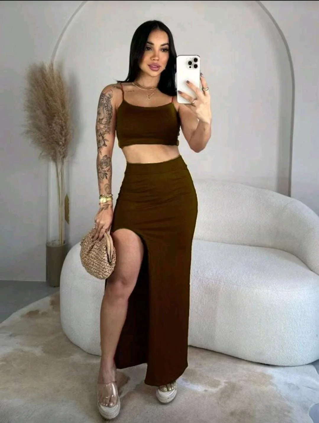 Conjunto Longo Cropped Alcinha Saia Com Fenda Lateral Modelagem Perfeita No Corpo Suplex Premium