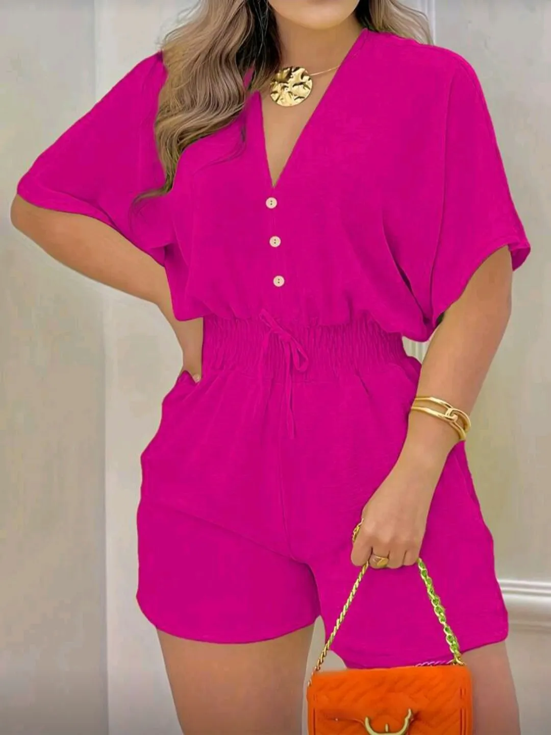 Macaquinho Feminino Casual de Cor Sólida com Decote em V e Botões