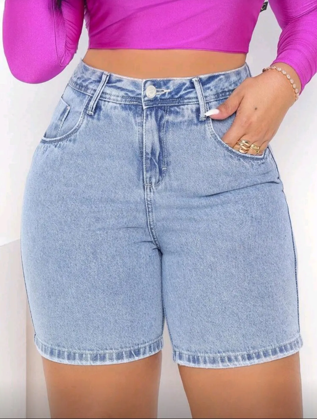Short Denim Feminino Meia coxa Com Lycra Cós Alto