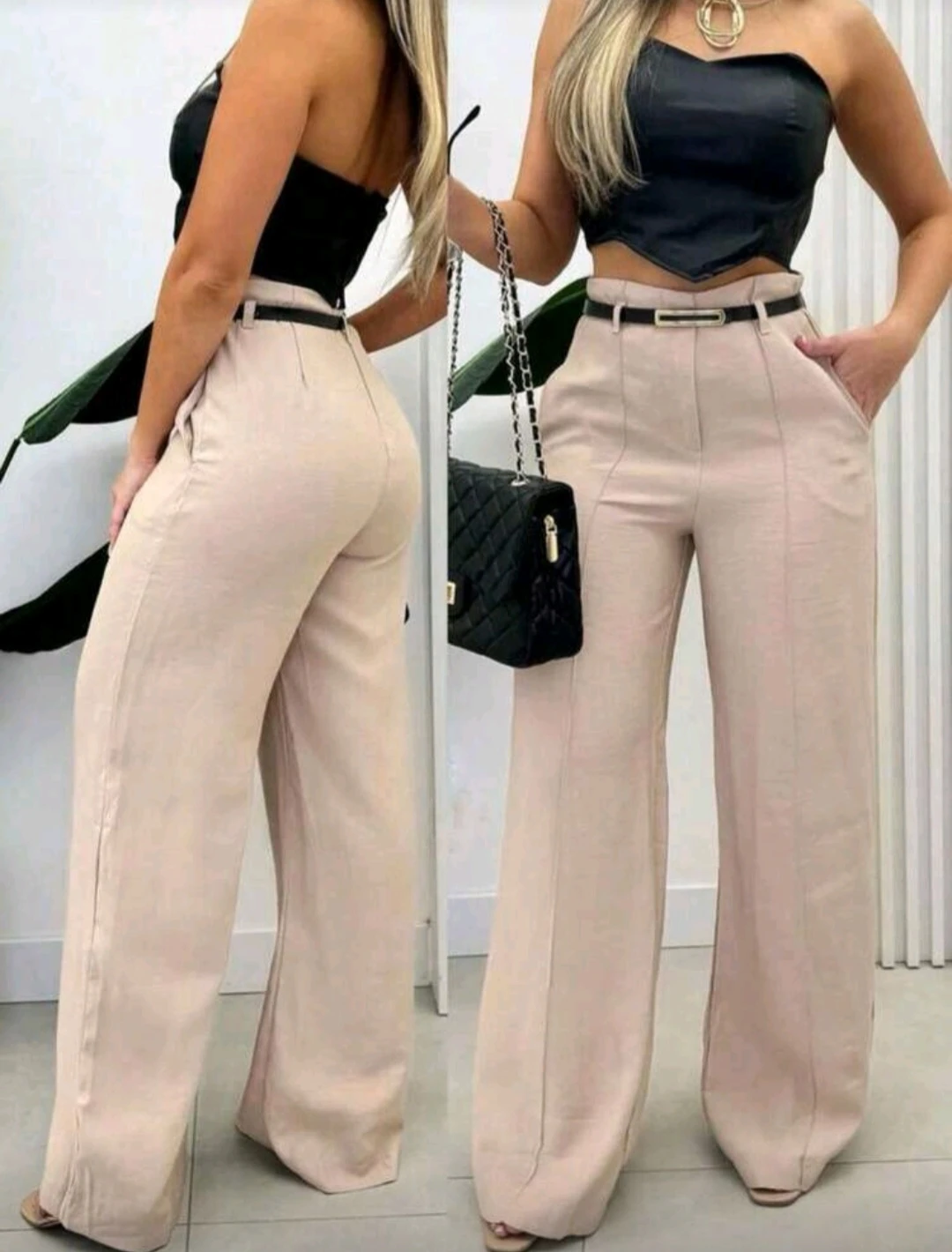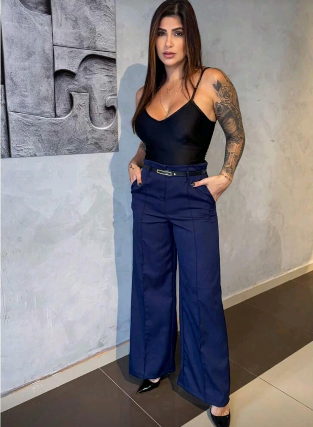 Calça alfaiataria pantalona feminina wide Leg com cinto e bolsos elegante cintura alta lançamento coleção nova roupas femininas