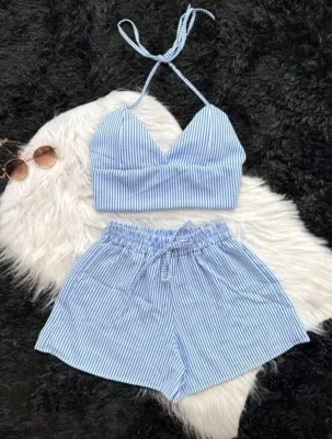 CONJUNTO 2 PEÇAS SHORT E CROPPED LISTRADO DUNA MODA THEND FASHION VERÃO
