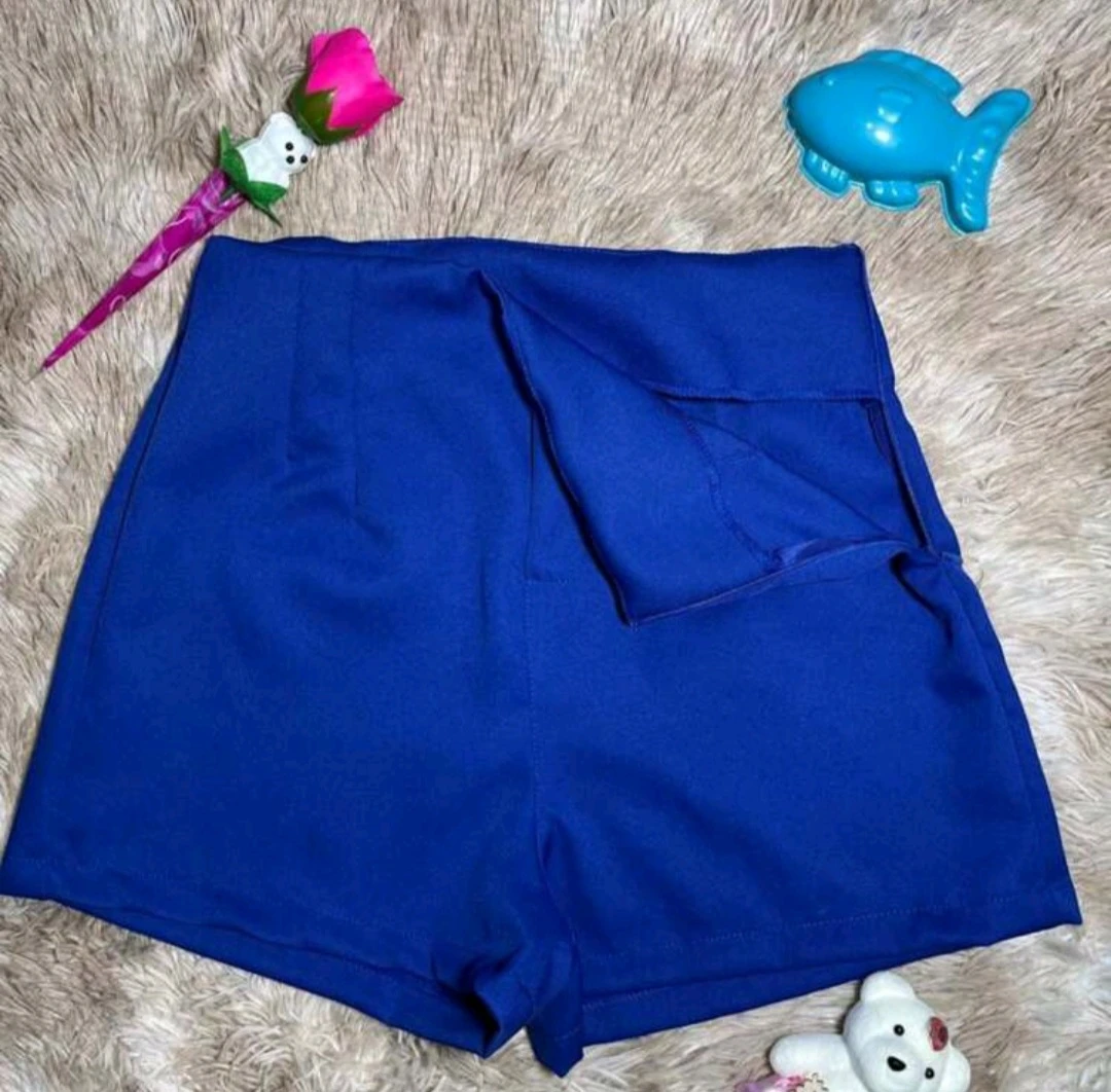 Shorts feminino azul, modelo de Alfaiataria com caimento elegante e cintura alta. Tecido leve e macio proporciona conforto durante o dia inteiro, ideal para trabalho, passeio ou viagem. Possui fechamento discreto e bolsos frontais úteis, acabamento impecável e toque suave. Combine com camisas, blusas ou tops para um visual moderno e versátil.
