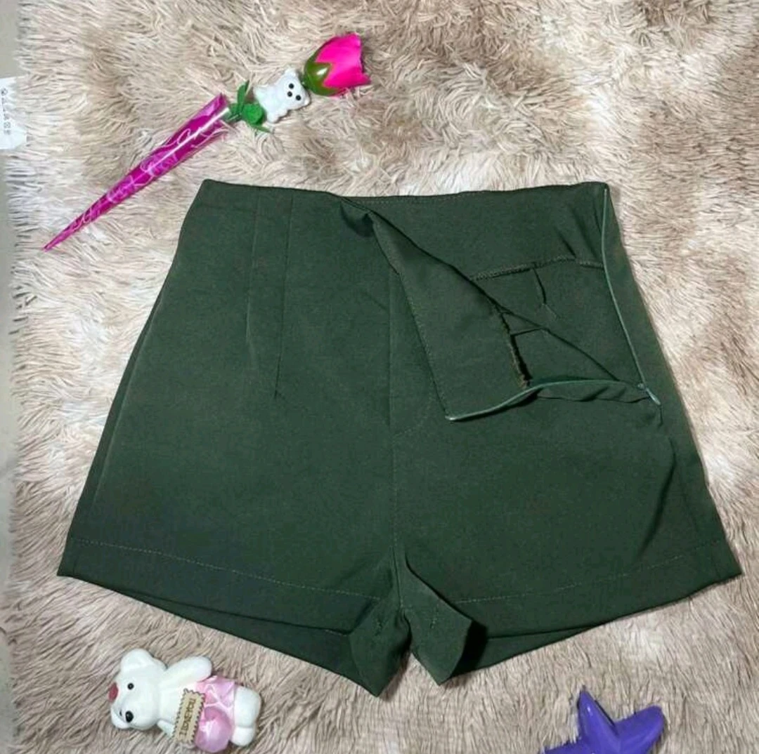 Shorts feminino alfaiataria verde-oliva, cintura alta com pregas frontais para um caimento sofisticado. Tecido encorpado, porém macio, oferece conforto o dia inteiro sem perder a linha. Fechamento lateral invisível e barra levemente dobrada garantem acabamento moderno. Ideal para trabalho, reuniões ou passeio elegante — combine com camisa, blazer ou sandália.