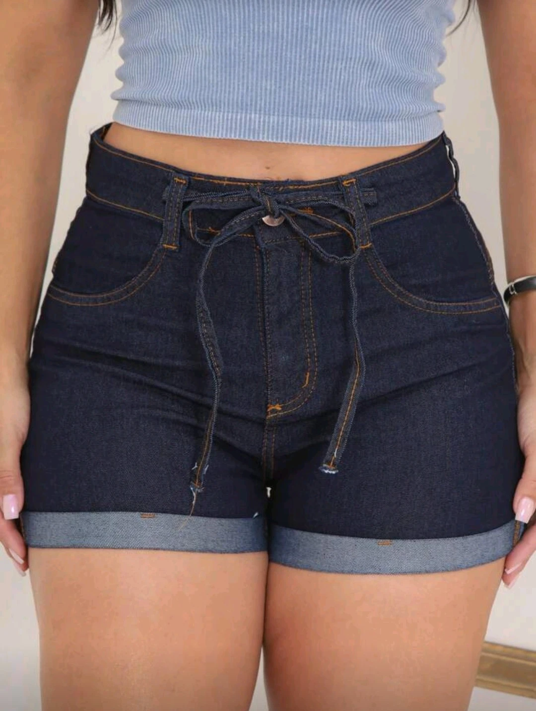 Shorts jeans feminino com lavagem escura, barra virada e cós com cordão ajustável para caimento perfeito. Denim resistente, bolsos funcionais e acabamento de qualidade que valorizam a silhueta. Confortável para o dia a dia, combina com cropped, regata e sandálias, ideal para passeios, finais de semana ou viagens. Versátil e prático para qualquer look casual.