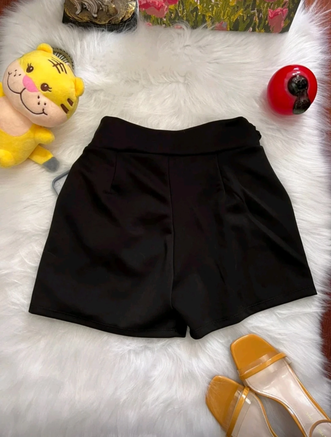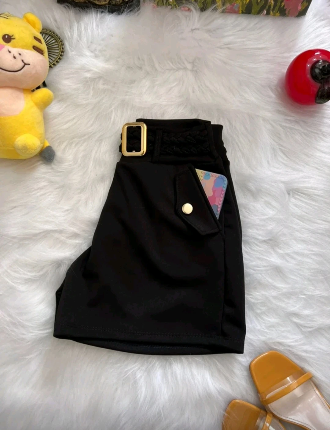 Shorts feminino preto em tecido encorpado, caimento alfaiataria com cintura alta e cinto fixo com fivela dourada, para um visual elegante e moderno. Bolso lateral com aba e botão acrescenta praticidade sem perder o estilo. Leve, resistente e fácil de combinar com camisas, blusas e tops. Ideal para trabalho, reuniões ou passeios sofisticados.